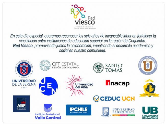 Red Viesco: 6 años fortaleciendo la Educación Superior y el desarrollo en la Región de Coquimbo En el marco de la celebración de su 6to aniversario, queremos expresar nuestros más sinceros votos y espíritu de colaboración para seguir contribuyendo al desarrollo de la región de Coquimbo. Red Viesco representa una invaluable Red de Instituciones…