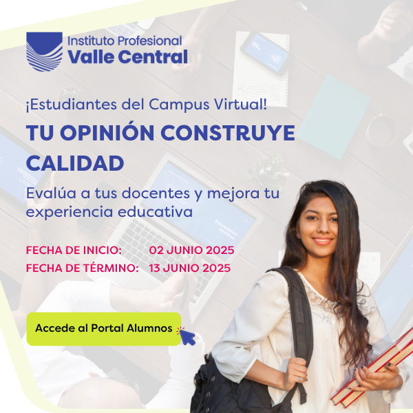 El Instituto Profesional Valle Central informa a su comunidad estudiantil del Campus Virtual que, desde el lunes 2 hasta el viernes 13 de junio de 2025, estará habilitado el proceso de Evaluación Docente, instancia fundamental para fortalecer la calidad del modelo educativo en modalidad 100% online.