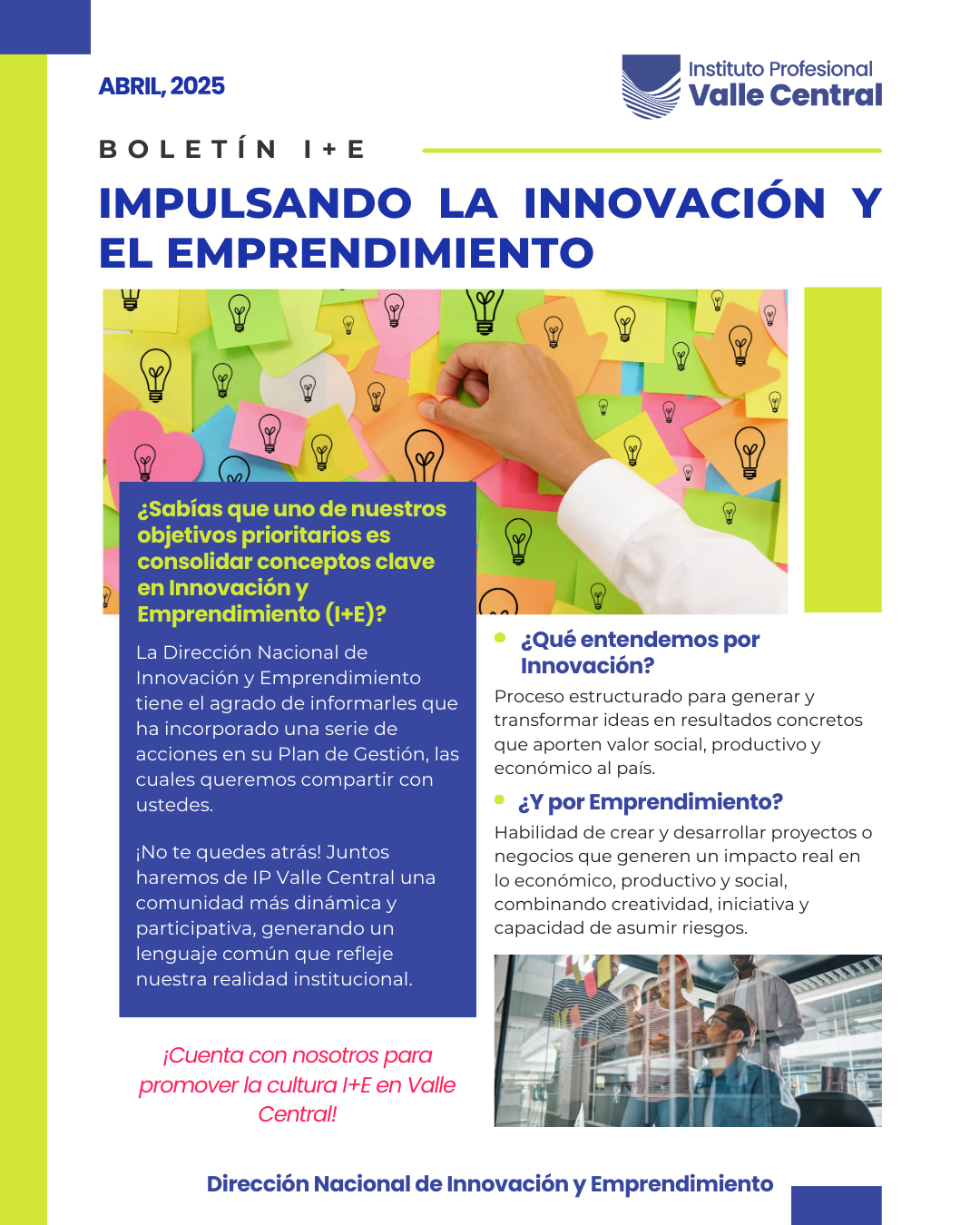 A través del boletín titulado “Impulsando la Innovación y el Emprendimiento”, se busca que estudiantes, docentes y colaboradores se familiaricen con el lenguaje y el enfoque que el IPVC está desarrollando para fortalecer una comunidad educativa que apuesta por la transformación, la creatividad y el compromiso social.