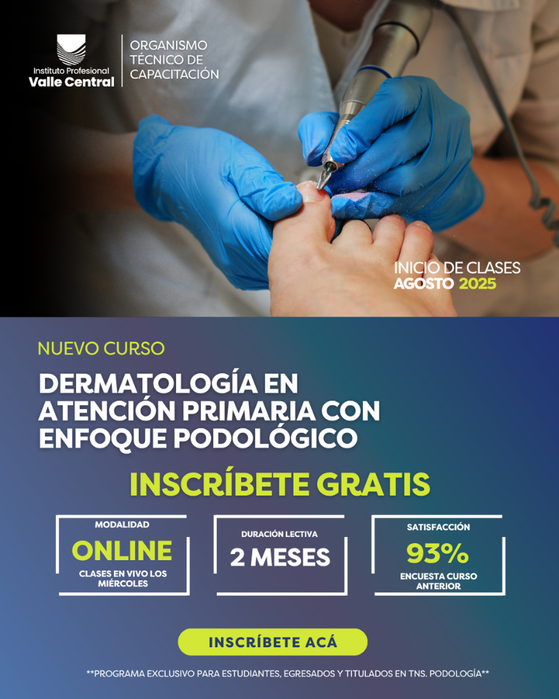 El Organismo Técnico de Capacitación del Instituto Profesional Valle Central lanza el curso “Dermatología en Atención Primaria con Enfoque Podológico”, un programa diseñado para fortalecer las competencias profesionales y entregar herramientas actualizadas para el diagnóstico y manejo de afecciones dermatológicas en el ámbito podológico.